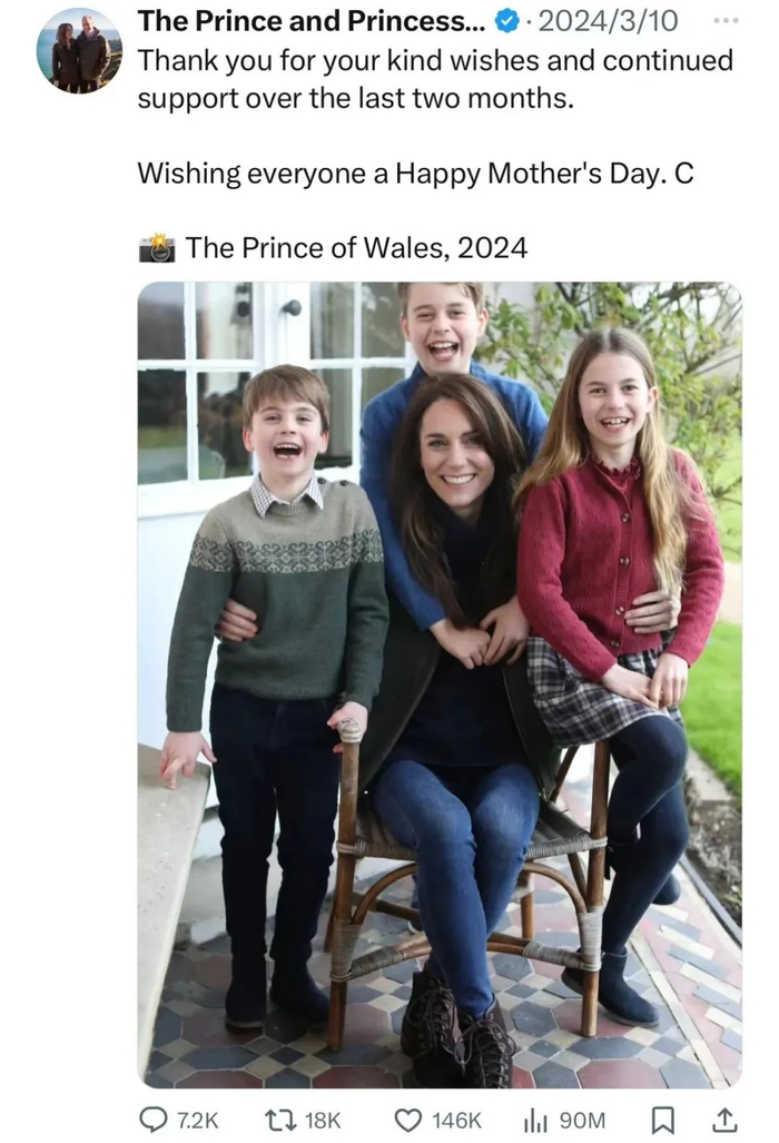 凯特王妃在社交媒体发布家庭合照,引发造假风波。