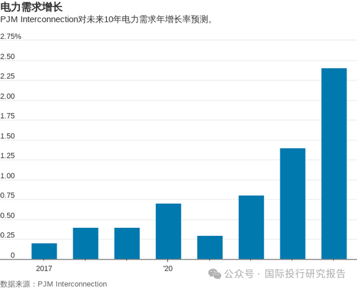 得益于能源效率的提高,美国的电力需求自2010年以来一直相对平稳。现在,AI带来的数据中心增长前景,以及《芯片法案》(Chips Act)推动的制造业近岸化和供暖、交通等领域的电气化,料将推动电力需求增长。麦肯锡(McKinsey)、波士顿咨询公司(BCG)和标普全球大宗商品(S&P Global Commodity Insights)都预测,到2030年,与数据中心相关的电力需求将以13%至15%的复合年增长率增长。PJM Interconnection预计,未来10年的总电力需求年增长率将达到2.4%,高于一年前预测的1.4%。该公司的营运范围包括数据中心密集的弗吉尼亚州。
