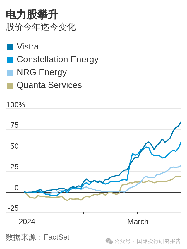 今年迄今为止,AI热已将Vistra股价推高了85%。这虽不及英伟达(Nvidia)令人瞠目的92%涨幅,但也远高于微软(Microsoft )同期12%的涨幅。拥有最具竞争力核能发电能力的美国最大核电站所有者Constellation Energy股价今年已累计上升60%,同期NRG Energy涨了32%。