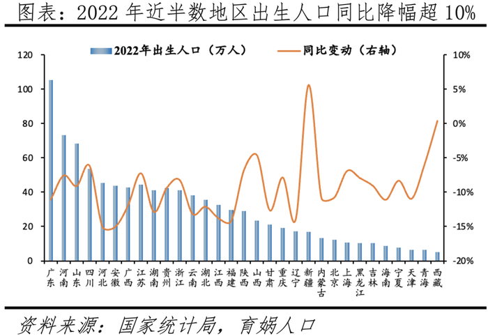 分省看,广东出生人口数量遥遥领先,河南、山东、河北等人口大省出生人口同比降幅介于5%-10%。从出生人口看,2022年出生人口前三的省份分别为广东、河南、山东,分别为105.2万、73.3万、68.2万人,合计占全国的27.4%,仅广东省出生人口超百万。从出生人口变动看,2022年安徽、河北两省出生人口同比降幅超过15%,福建、辽宁、江西、云南等13个省级以上区域出生人口降幅介于10%-15%,贵州、山东、吉林等14个省级以上区域出生人口降幅介于0%-10%,仅西藏、新疆两地出生人口同比小幅正增。