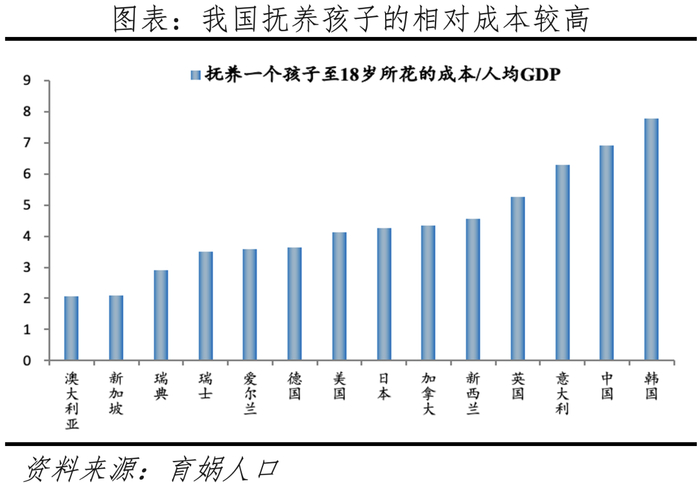 3)住房、教育、医疗等直接成本高是抑制生育行为的三大因素,“四二一”结构的家庭养老负担重、挤压生育,女性劳动参与率较高但就业权益保障不够,导致机会成本高。根据育娲人口发布的《中国生育成本报告》,在统计的14个国家中,全国家庭0-17岁孩子的养育成本平均为48.5万元;0岁至大学本科毕业的养育成本平均为62.7万元。如果把一个孩子抚养到刚年满18岁所花的成本相对于人均GDP的倍数进行国际对比,澳大利亚是2.08倍,法国是2.24倍,瑞典是2.91倍,德国是3.64倍,美国是4.11倍,日本是4.26倍,中国是6.9倍,几乎是全球最高的。