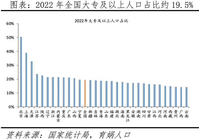 从受教育程度看,根据抽样调查数据,2022年全国具有大专及以上、高中、初中、小学及以下文化程度的人口占比分别为19.5%、16.4%、34.3%、29.8%,较2020年分别变动2.3、-0.4、-4.1、2.2个百分点。根据普查数据,2020年具有大专及以上、高中、初中、小学及以下文化程度的人口占比分别为17.2%、16.8%、38.4%、27.6%。2010年具有大专及以上、高中、初中、小学及以下文化程度的人口占比分别为10.1%、15.9%、43.8%、30.2%。分区域看,2022年北京具有大专及以上学历人口占比50.3%、为最高,上海、天津具有大学文化程度的人口占比介于30%-50%,学历水平较高;江苏、陕西、辽宁等8个省级以上地区介于20%-30%,宁夏、吉林、青海等20个省级以上地区小于20%。