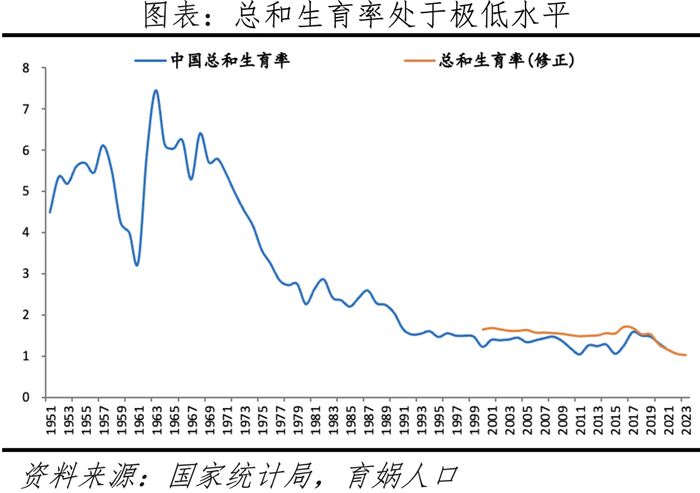 中国总和生育率从1970年代之前的6左右,降至1990年的2左右,再降至2010年后的1.5左右,2022年1.05,2023年仅1.0左右,在全球主要经济体中倒数第二(仅比韩国略高)。根据我们计算,2016年总和生育率冲高至1.7、较2015年明显上升,2017年略降,2018年明显下降至1.5左右,2019年基本持平,2020年仅1.3,2021年已降至1.15,2022年1.05,2023年1.0左右(按照出生人口902万估算)。从国际比较看,2022年法国、美国、巴西、英国、德国、日本、韩国总和生育率分别为1.8、1.7、1.6、1.6、1.5、1.3、0.7,中国总和生育率全球倒数第二。