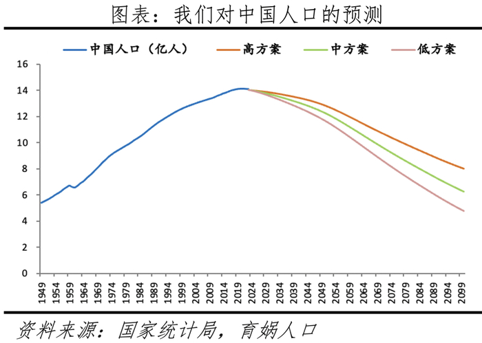 根据育娲人口《中国人口预测报告2023》,如果没有实质有效的鼓励生育政策出台,生育率下降趋势难以扭转,2050年中国总人口将下降至11.72亿,2100年中国人口将降到4.79亿,占世界人口比例将从现在的17%降至4.8%。如果总和生育率一直较低,那么总人口将陷入持续负增长。人口见顶之后前25-30年内萎缩速度较慢,但随着1962-1975年高生育率时期出生人口进入生命终点,2050年左右开始,萎缩速度将明显变快。