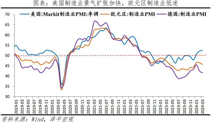 2)3月新出口订单51.3%,比上月大幅回升5.0个百分点,为2023年4月以来首次回升至扩张区间。从行业看,化学纤维及橡胶塑料制品、汽车、计算机通信电子设备等行业的新出口订单指数扩张。美国制造业景气持续扩张,经济韧性好于欧元区。3月美国Markit制造业PMI为52.5%,扩张速度略加快;欧元区制造业PMI为45.7%,德国制造业PMI为41.6%,连续二十一个月位于收缩区间。3月韩国前20日出口同比11.2%;越南出口同比15.0%。