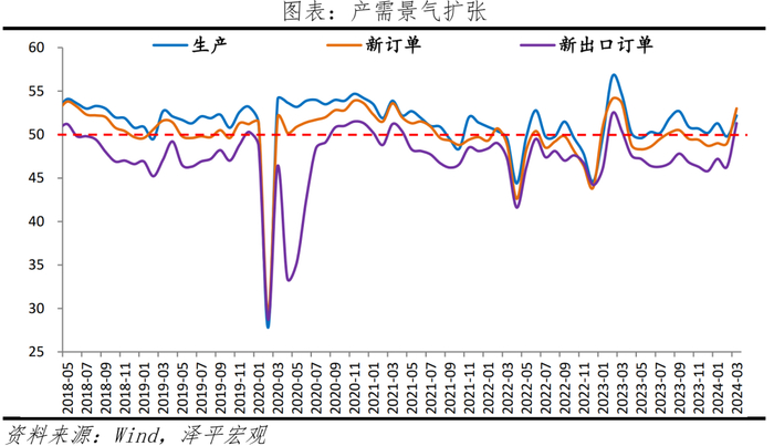 1)大型企业产需持续扩张。生产指数52.7%,较上月回升1.5个百分点;新订单指数53.4%,高于上月2.1个百分点。新出口订单51.8%,回升2.7个百分点。