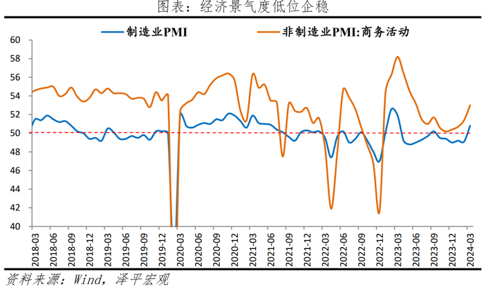 近期,政策进行了积极部署;GDP增速目标设定“5%左右”、提振信心,并加大财政支持力度,“新质生产力”被列为十大工作任务之首。《推动大规模设备更新和消费品以旧换新行动方案》出台,提振内需。3月22日,国常会定调房地产支持性政策,加强保交楼、房地产融资协调机制,系统谋划相关支持政策、有效激发潜在需求,加大高品质住房供给,加快完善“市场+保障”的住房供应体系;叠加前期货币政策大幅降准、降息,地方因城施策放松限购限贷等。
