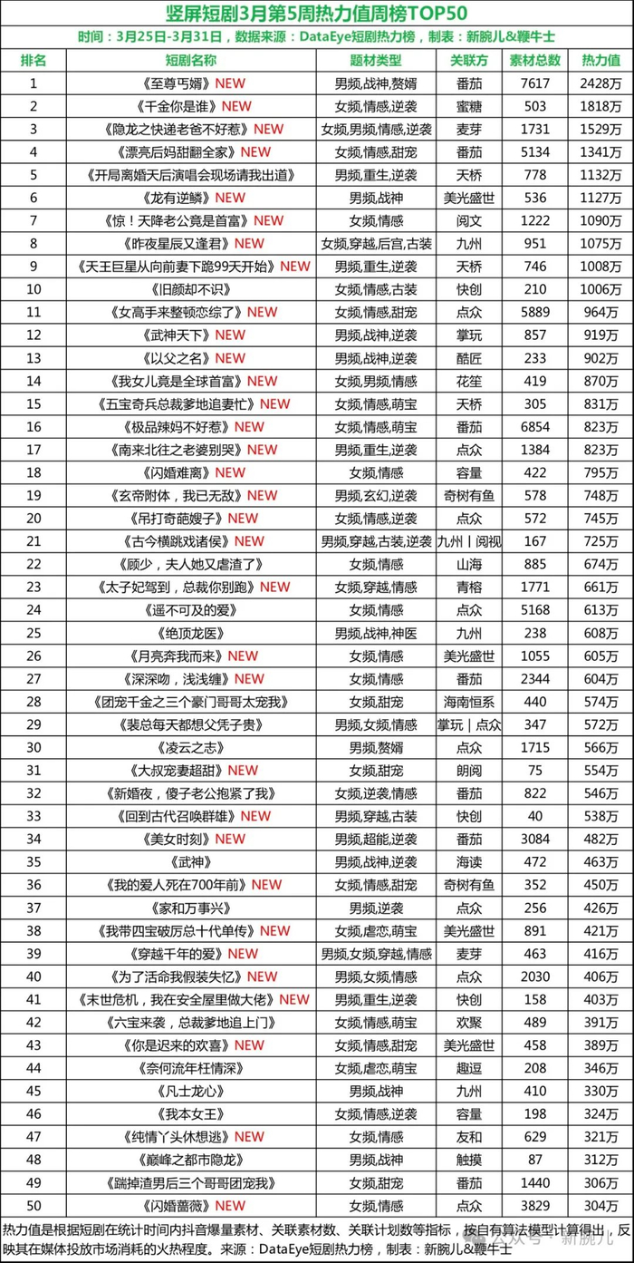 4月1日消息,新腕儿联合DataEye发布3月第5周短剧热力周榜,时间为3月25日-3月31日完整自然周。