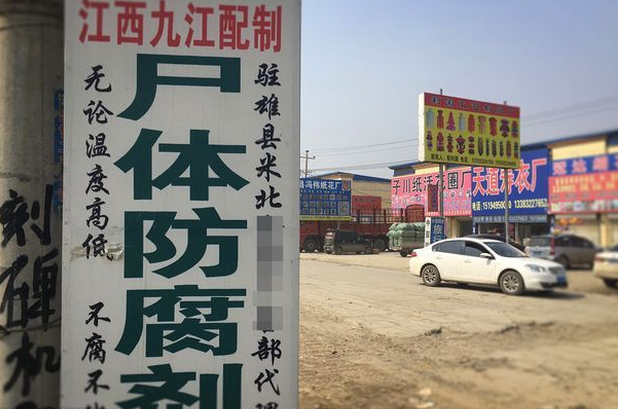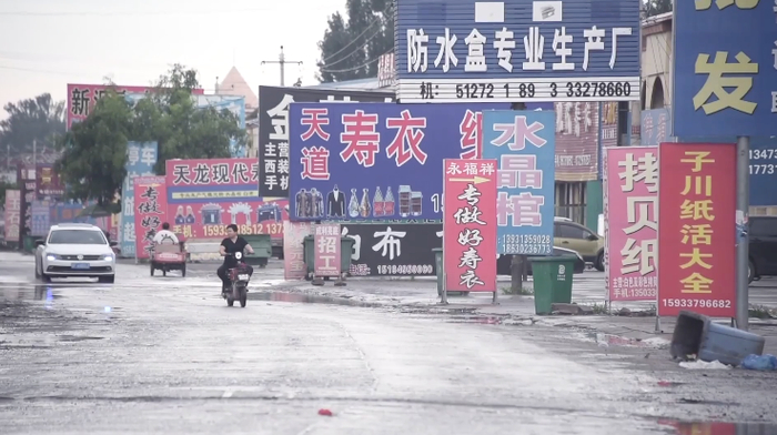 庄上一条一公里长的街上,聚集着500多家殡葬用品专卖店,据坊间传闻他们掌控着全国90%的丧葬用品交易。