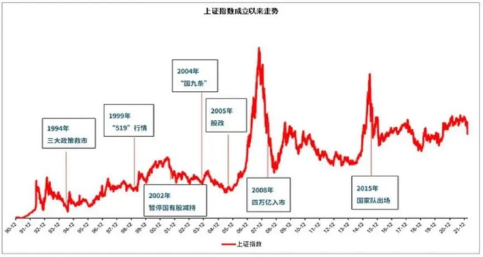 过去30年间,尽管A股总体向上,但波动剧烈。期间多次的异常大波动可以被定义成“股灾”了,而对市场一直呵护有加的管理层每次都果断出手救市,大大小小救市行动难以胜数,其中“暂停新股发行IPO”历史上就被作为主要的救市手段而使用了9次,而几次最典型、最有力的救市组合拳分别发生在1994年、2004年、2008年和2015年。(见下图)