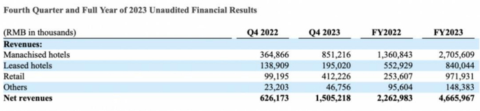 财报显示,2023年亚朵集团实现营收46.66亿元,同比增长106.2%;调整后净利润9.03亿元,同比增长248.3%;调整后EBITDA为12.07亿元,同比增长184.3%。