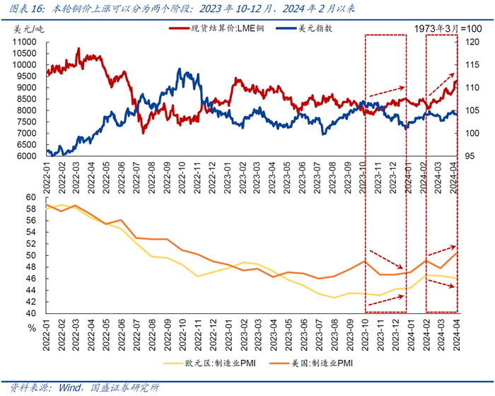 >复盘看,本轮铜价上涨可分两个阶段:2023年10-12月;2024年2月以来;
