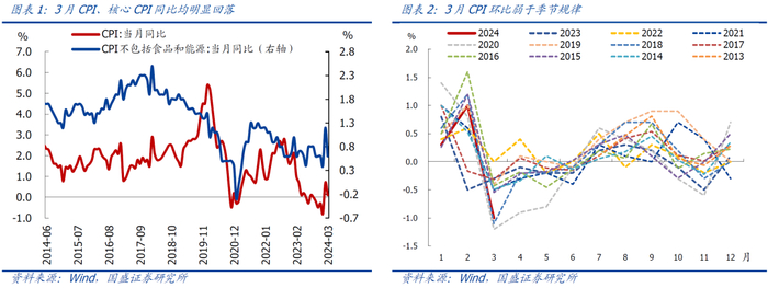 1、3月物价核心变化在于:CPI和核心CPI均明显回落、低于预期也低于季节性,食品、旅游出行价格回落是主要拖累;PPI延续走弱、环比连续5月下降,钢铁、水泥等基建链价格走低是主要拖累。