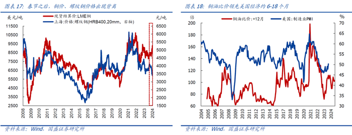 >对比看,关注两点:铜价(内外需决定)VS螺纹钢价(内需决定)走势背离;铜油比2023年12月开始见顶回落;