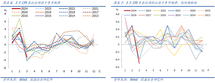 >CPI食品分项VS非食品项:由于节后需求下降,食品、出行价格明显下跌,带动CPI食品、非食品项回落较多。3月CPI食品分项环比-3.2%,相比前值回落6.5个百分点、弱于季节规律(2014-2023年3月环比均值为-2.2%),其中:由于节后需求下降+气温偏高、供给充足,鲜菜、猪肉、鸡蛋、鲜果和水产品价格分别下降11.0%、6.7%、4.5%、4.2%、3.5%,合计拖累CPI环比约0.54个百分点。非食品项环比-0.5%,相比前值回落1.0个百分点、同样弱于季节规律(2014-2023年3月环比均值-0.04%),节后出行需求下降是主要拖累,机票、交通工具租赁、旅游价格分别环比下降27.4%、15.9%和14.2%,合计拖累CPI环比约0.38个百分点。