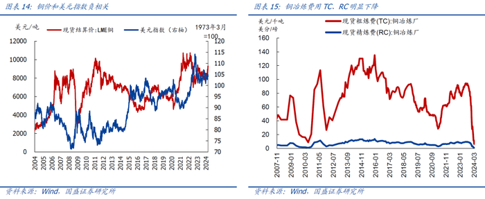 2)2024年2月以来,这一阶段铜价支撑因素有所增加,铜价上涨更快,具体包括:一是美国经济强于预期,ISM制造业PMI时隔16个月重回荣枯线上;二是在出口带动下,中国制造业投资显著回升,1-2月同比增速录得9.4%,尤其是耗铜较多的新兴行业,比如电气机械、通信电子等投资增速延续偏高,分别达到24.1%、14.8%;三是秘鲁等地铜矿关停愈演愈烈,铜矿供给扰动增加;而且,前期铜矿供应减少导致下游冶炼减产,TC(铜冶炼厂现货粗炼费)、RC(铜冶炼厂现货精炼费)大幅下行,铜矿关停的影响进一步向下游传导;四是3月美国CPI同比再度上行,带动美国通胀预期(10Y美债收益率-TIPS)走高。