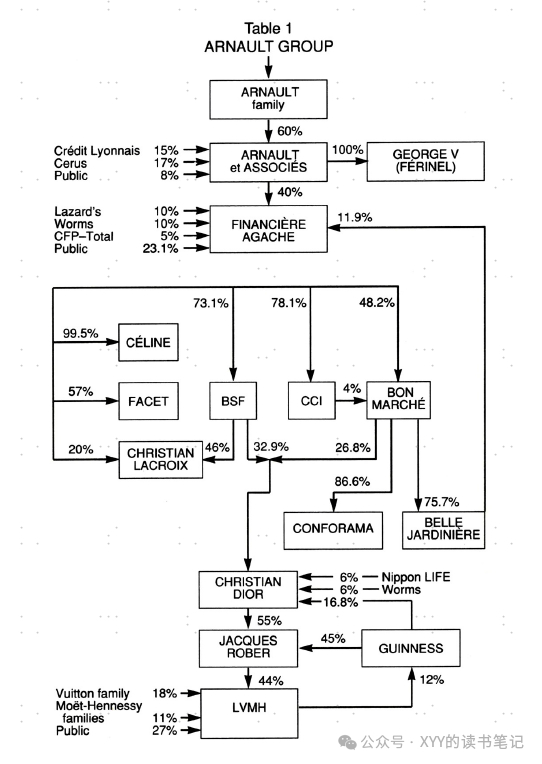 Bernard的财技。Bernard受益于并购时代,而其经验不断积累也形成自身独有的财技,比如其利用Cascades串联公司,与其直接持有某家公司51%股份,不如先持有51%金融控股公司B股份,然后用B公司持股51%公司A,这样可以将金融杠杆用得更加极致。但这种手段坏处就是在获得控制权过程中必然会产生各种纷争,这也为后续LVMH控制权获得过程中激烈纷争埋下了伏笔。IPO融资也是Bernard常见融资手段,在私募股权市场充分融资后,他会将相关公司通过IPO进行融资。下图展示了Bernard当时资产帝国股权架构,其家族持股Anault Associates 60%股权,这个控股公司则通过Financiere Agache等主体公司控制了Dior,Celine等具体生意。在一系列资产重组操作后,Bernard 旗下生意年营收达到117亿法郎,利润达到4.5亿,其首先选择发行生意Conforama上市,出售15%股权。此后Anault Associates 也上市,出售10%股权。1987年,Bernard的眼光开始盯上一个新的猎物——LVMH集团。
