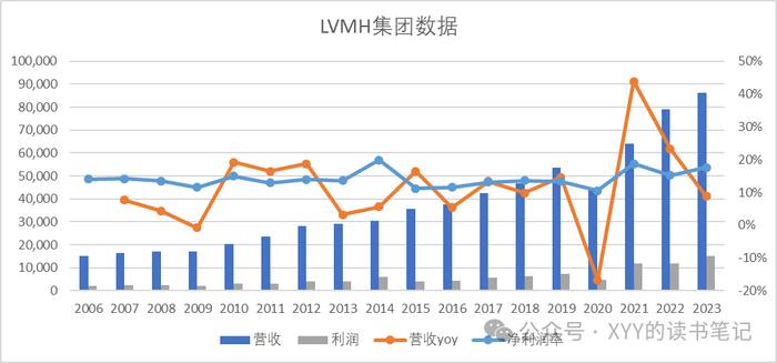 从整体来看,LVMH2022年营收790亿欧元中,大约48%半壁江山是时尚&包等奢侈品,大约18%是零售,14%珠宝和手表,10%是香水和化妆品等。从下图可以看出来,2006-2023年,LVMH集团收入CAGR是10.7%,利润的CAGR是12.2%,净利润率持续提升。而从每年增速来看,呈现出一定周期性。从市值来看,目前LVMH市值是4090亿欧元(约为4400亿美元),PE约为27倍,不算便宜。从商业模式来看,LVMH和宝洁挺像的,但我的直觉是LVMH的壁垒更高,奢侈品品牌背后的历史沉淀是几乎无法复制的。而奢侈品永不过时的属性倒是和宝洁的快消日用品类差不多。