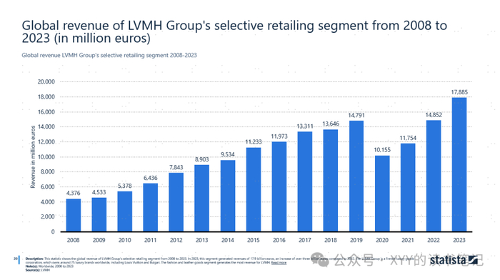 LV的发展历史。Louis Vuitton于1851年被法国皇家看重为他们量身定做外套(Crinolines),在打包了诸多衣服后,他又发明了现代行李箱,此后LV开始在巴黎(1871)、伦敦(1895)、美国(1908)等地方开店,成为一家高档但小众的家族企业。1896年,LV发明了经典的Monogram系列产品,一直风靡至今。1977年,Henry Racamier通过和Vuitton家族结婚,成为女婿开始主掌LV。Henry决定一方面保持LV高档奢侈品牌定位,他将LV的故事和法国皇族深度绑定,此外他坚持采用Made in France,保持产品质量;另一方面积极开拓全球销售渠道,且不做品牌授权(例如Dior),全部店面都自营,Andre Sacau是LV开拓渠道的主要负责人。LV的营销分三层,第一层是Henry的女婿负责,其和外部广告公司合作,将LV与全球旅行联系起来;第二层是公司营销部门从艺术、女性、经济金融高端媒体角度来营销(抓住高端客群,赞助各种艺术活动,体育赛事等);最后Henry善于经营自己的形象。1977年,LV整体营收是7000万法郎,利润是700万,员工数量100人。到1984年,员工达到1217人,营收达到11亿法郎,利润达到2亿,增长速度很快,不过绝对体量仍然算不上大,其后来上市进程也不太顺利。