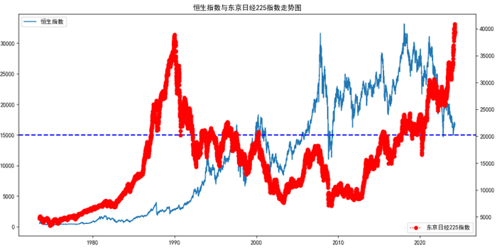 美股我们知道,一直涨,我们看日经225指数和恒生指数的走势对比。可以说从2000年开始,日经225指数跟恒生指数的走势还是非常匹配的,就像舞池里面一对翩翩起舞的爱人。