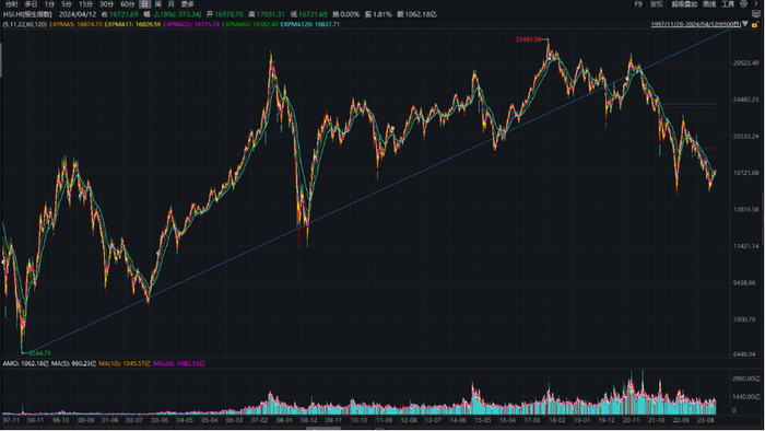 上图是97年以来,恒生指数的走势图,中间的线是趋势线。历史上,恒生指数的走势都在这根线之上。变化出在2021年7月,在这之后,恒生指数掉头向下,与沪深300指数走势趋向一致,从而与美股、日经指数分道扬镳。