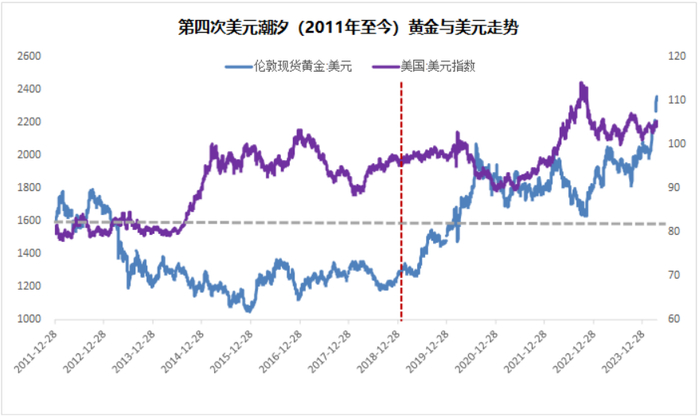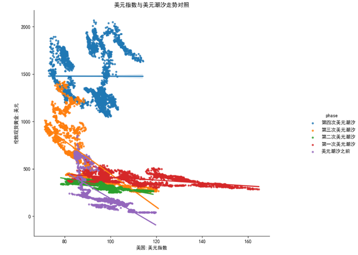 从1980年以来的四次美元潮汐,前三次美元总体上与黄金呈现比较明显的负相关关系,尤其是潮汐之前和第三次美元潮汐拟合线的斜率更加陡峭。而最近的这一次也是第四次美元潮汐拟合线基本上已经是一根直线了,这意味着美元指数已经跟黄金价格脱钩了。