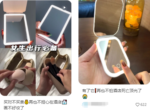 别再问酒店灯光有多刺挠,就看便携补光镜打起广告来用啥文案就知道了:“再也不担心酒店的死亡顶光了”、“原来在酒店也是可以化妆的呀”。