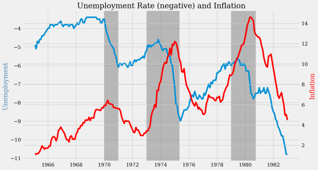 从1973年到1975年中期的滞胀是严重的。在此期间,失业率从4.9%急剧上升到8.2%,而通货膨胀率更是从3.4%上升到10.2%。