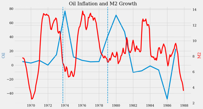在1976年第一次石油禁运前后,尽管油价飙升,M2的增长率却极高。