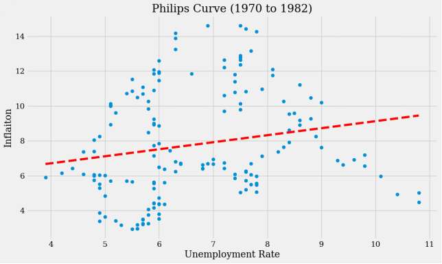 从1970年到1982年,菲利普斯曲线斜率变成了正的。
