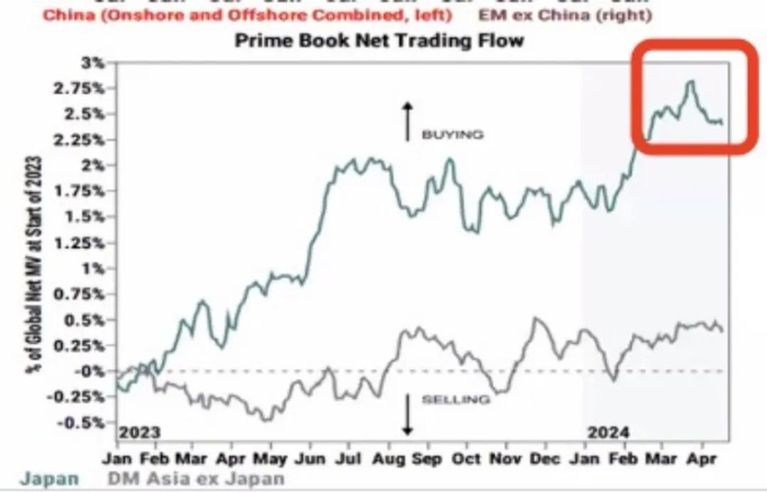 高盛的研究显示,对冲基金对于中国的净配置仍在5年的低位,但已经有所回升。4月开始,对冲基金对日本股市的增配开始下降,部分资金可能转为配置到亚洲其他市场。
