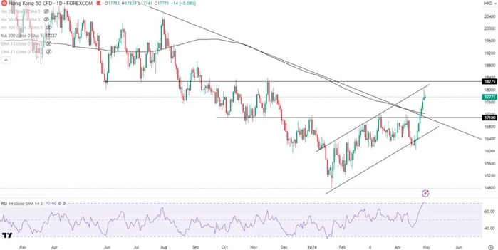 香港恒生指数在2024122日触底,当日收盘报14961点,也就是跌回了1997年的水平,那时绝望和投降式抛售(capitulation)主导了市场。然而,再平淡的市场也会出现技术性反弹,415日到19日的那周,恒指大幅跳升7.5%领涨全球主要股指,周线图上形成看涨吞噬形态在截至29日的过去8个交易日连续上扬并冲破了长达3年的下降趋势线和200天均线多头的下一个显著目标为18000~18200区域五一期间已经突破至18500附近,这里接近通道上轨,也是去年4季度的高点。