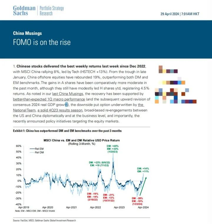 高盛认为,这一复苏得到了几个因素的支持——一季度宏观表现好于预期(部分机构开始上调2024年实际GDP增长预测)、“国家队”提供的“看跌期权”下行保护、2023年第四季度业绩较强、中美在外交和商业层面的接触广泛重启,以及“国九条”推出。