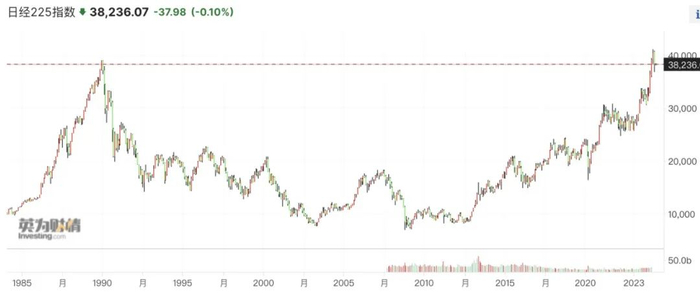 美股可谓风头无两,从去年的最低位3600点附近暴涨超1600点一度逼近了5300点(标普500);日本股市更是令人跌破眼镜,日经225指数一年来的涨幅一度逼近了45%,一度突破41000点的历史新高,冲破了90年代泡沫经济破灭前的最高点。