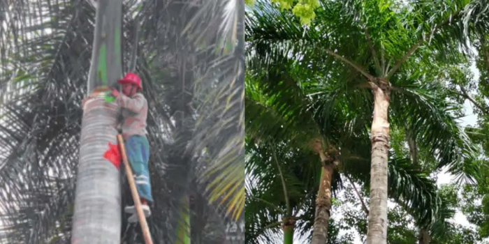 相比于树木整个倒伏,对道路设施破坏严重,且不易清理,后续补种、恢复麻烦,只是折枝断叶的大王椰不仅对树本身的伤害相对较小,给人类的生活和财产带来的伤害也没那么高,只要留意别被落叶砸到就好。