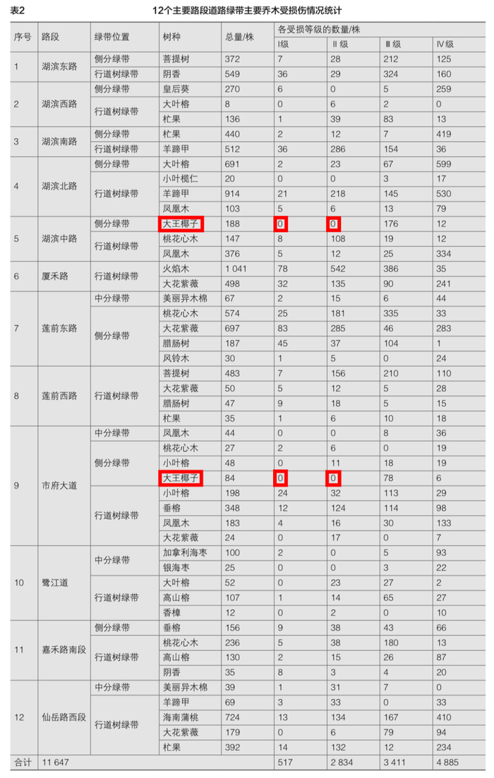 研究者将行道树的受损程度划分为四个受损等级:I级(倒伏-清运)、II级(倒伏-扶正)、III级(未倒伏-断折枝干叶)、IV级(未倒伏-轻微影响)。通过表格可以看出,在本次台风中,大王椰的树木I级受损率和II级受损率均为零,但断折枝叶情况比较严重,受损率达93.38%。