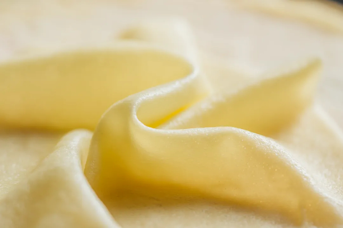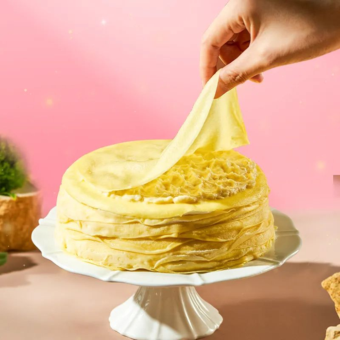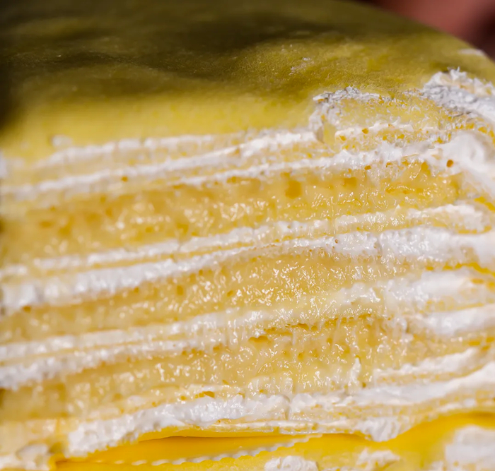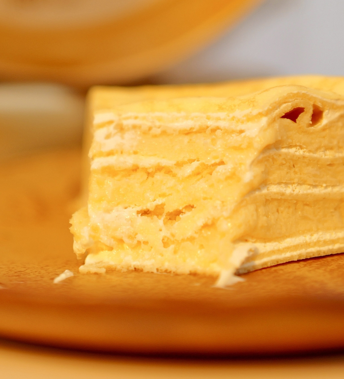 配方升级,选用优质牛乳,加入鸡蛋调制出秘制面浆,经低筋面粉与黄油的打发,赋予其柔韧有嚼劲的口感,制成张张轻薄Q弹的千层皮。