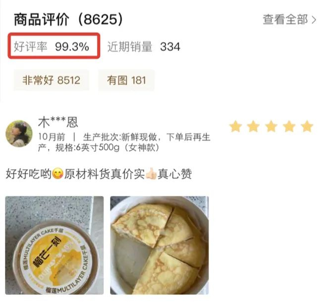 榴莲千层蛋糕是他们家的招牌产品,在一条生活馆上架后十分受欢迎,好评率高达99.3%。(数据截止至2024年4月29日)