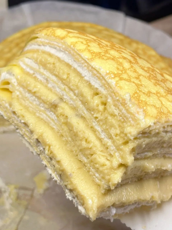 一层班戟皮、一层奶油、一层榴莲肉,层层堆叠。