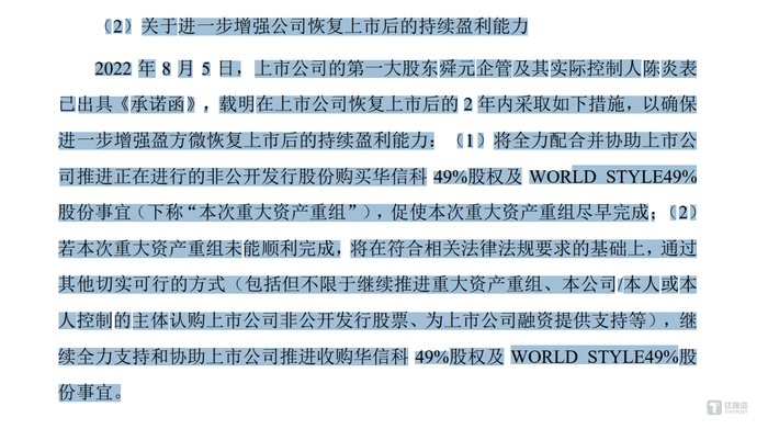 当时,盈方微第一大股东浙江舜元企业管理有限公司(下称浙江舜元)作出承诺:在恢复上市后的2年内,继续全力支持和协助上市公司推进收购华信科及World Style剩余各49%股份事宜。