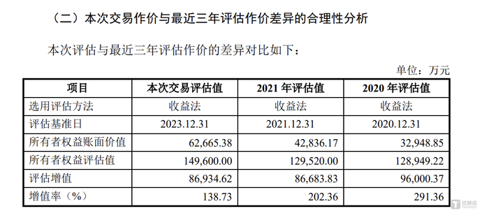 本次评估以2023年12月31日为基准日,标的公司股东全部权益合计的评估值为14.96亿元。值得注意的是,评估值较基准日账面净资产6.27亿元相比,增值了8.69亿元,增值率为138.73%。经双方协商后,确定本次交易价格为7.33亿元,且不设置业绩补偿。