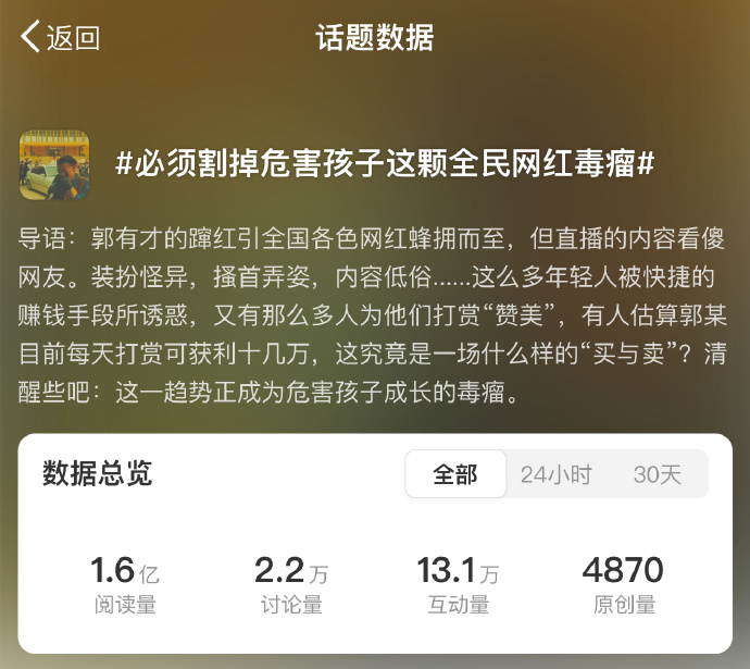 而在“必须割掉危害孩子这颗全民网红毒瘤”的呼喊中,对郭有才现象的反思,终于进入了高潮——在新闻跟帖下面,我看到不少网友留言,呼吁关闭打赏,甚至呼吁禁止网络直播。