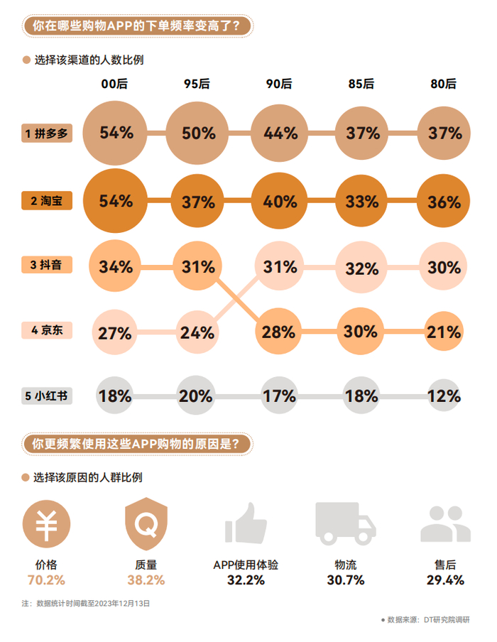 DT研究院调研数据显示,2023年消费者更频繁使用的购物软件TOP5为:拼多多(45.8%)、淘宝(40.3%)、抖音(29.9%)、京东(28.1%)和小红书(17.5%)。价格是驱使消费者使用拼多多最普遍的理由。