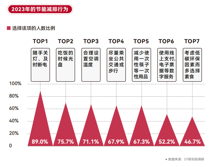 在节能减排的行为中,年轻人最经常做到的是随手关灯、及时断电,比例高达89%。在循环利用资源方面,双面用纸、双面打印被践行得最多,践行率达到了76.1%。