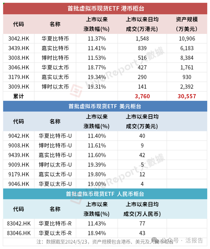 据LiveReport大数据统计,截至5月23日,3只比特币现货ETF和3只以太币现货ETF上市至今的涨幅均在10%以上,6只港币柜台的ETF上市后日均成交额约3760万港元。