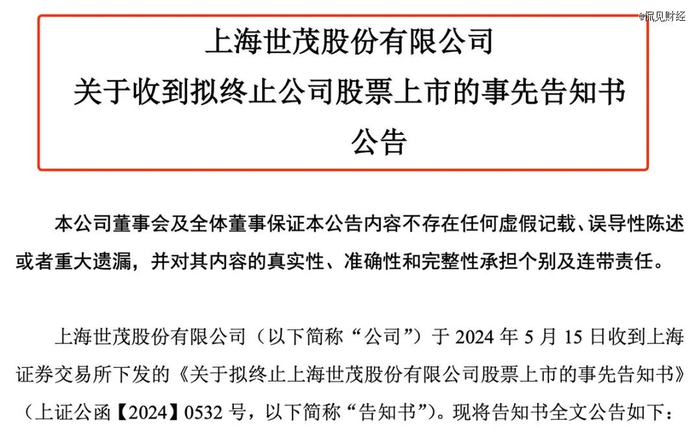近日,世茂股份公告称,公司收到上交所下发的《关于拟终止上海世茂股份有限公司股票上市的事先告知书》。