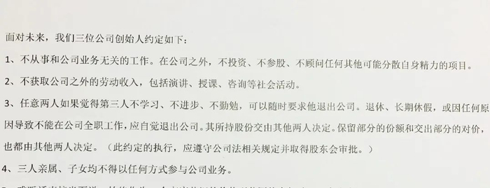 这其中大家可能稍微有点不理解的就是关于收入的条款:为什么我们严格要求所有的收入必须来自这家公司的财务室发的工资或者奖金,不能有任何一笔外面的钱?外出讲课赚的几千块钱的讲课费,出书获得的几万块钱稿酬,不都是个人劳动所得吗?因为人心是非常微妙的。比如我在外面讲课是能收到讲课费的,但如果我把讲课费装入自己口袋,这就在三个人之间撕开了一条不信任的缝隙。所以我们一开始就约定,无论什么钱都归公司,哪怕我们三个人坐下来决定将这笔钱作为奖金再发给个人都行。但是不准直接揣到自己兜里。