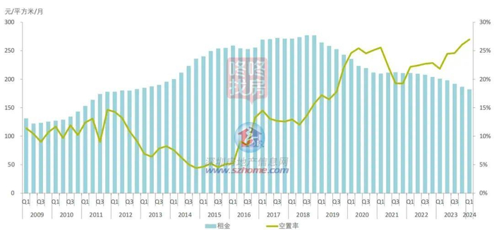 深圳的空置率最高,2024年一季度,深圳甲级写字楼空置率继续上涨至27.0%。