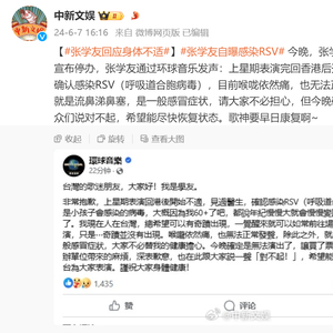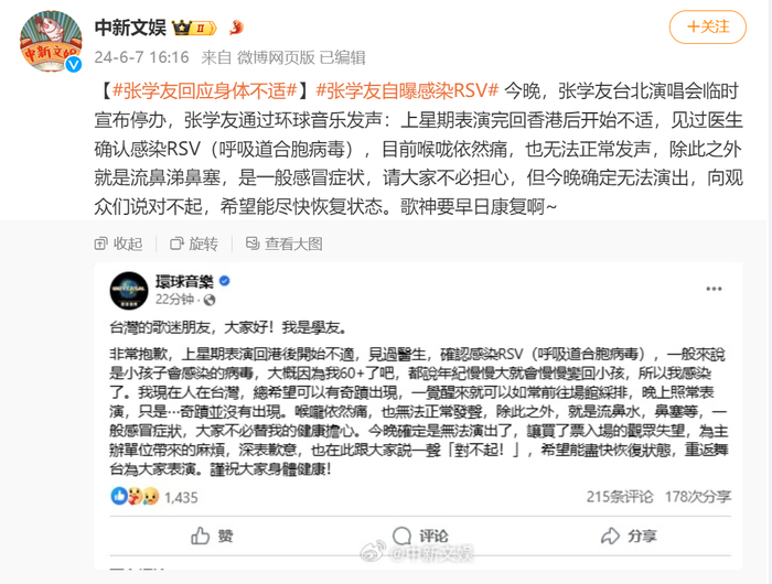 随后,张学友通过环球音乐发文,称上星期表演完回香港后开始不适,见过医生确认感染RSV(呼吸道合胞病毒),目前喉咙依然痛,也无法正常发声,除此之外就是流鼻涕鼻塞,是一般感冒症状,请大家不必担心,但今晚确定无法演出,向观众们说对不起,希望能尽快恢复状态。