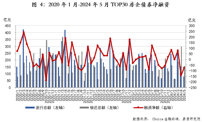 5月TOP30房企净融资额为-75.8亿元,较上月有所提高,偿债压力有所缓解。